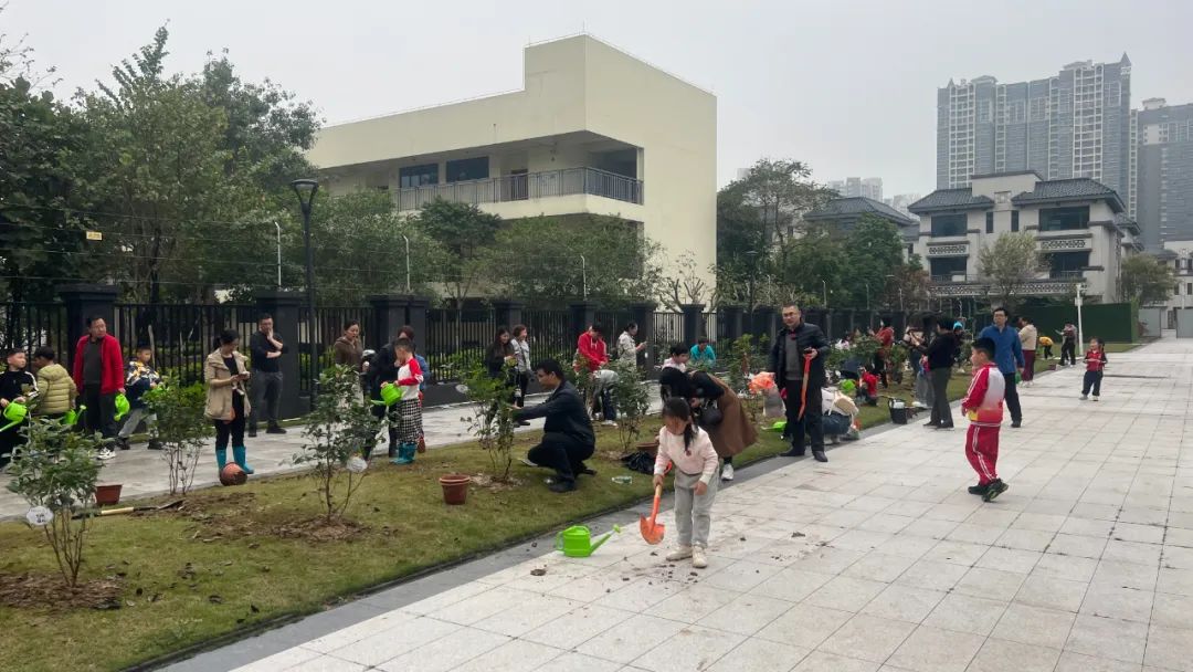 活动当天,阳光明媚,微风轻拂,在欧雅春天花园别墅区,大小朋友们早早来到指定的绿化区域,手中握着象征生命的树苗,眼中闪烁着期待与好奇的光芒。大家穿上装备,挥舞铁锹,一铲一铲地挖坑、填土、浇水,每个步骤都饱含着对自然的尊重与热爱。 在这场别开生面的亲子植树活动中,爸爸妈妈们耐心指导,孩子们积极参与,不仅亲手种下了象征希望的小树,更在过程中学会了团队协作,体会到了辛勤劳动带来的喜悦。温馨的场面随处可见,无论是合力搬运树苗的身影,还是稚嫩的小手轻轻抚摸新栽树苗的画面,都深深地印刻在了每一位参与者的心中。